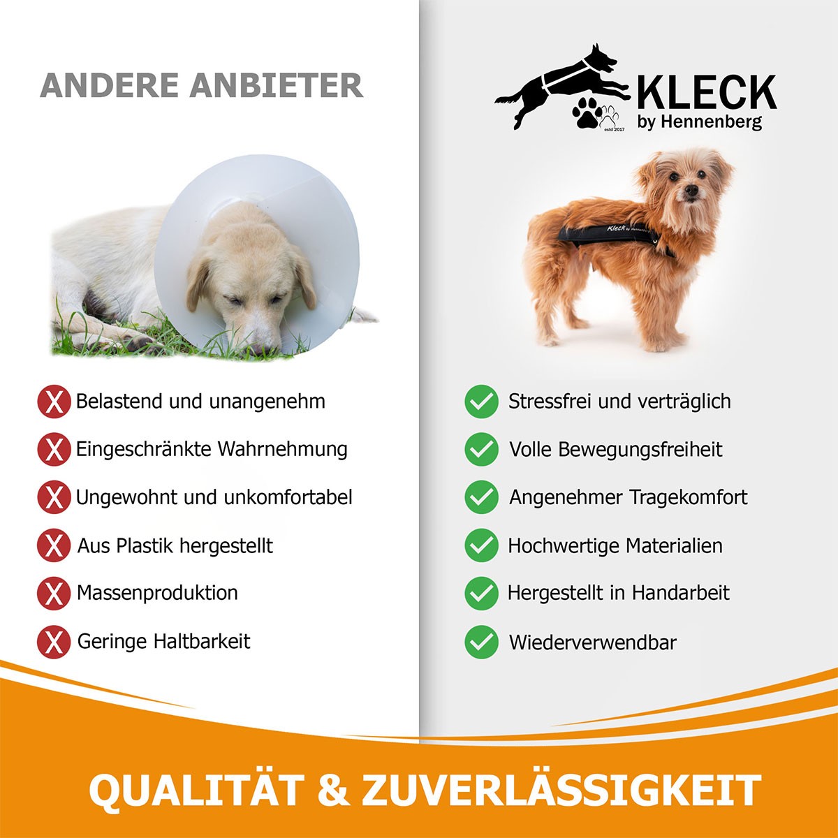 Der Kleck-Leckschutz für Hunde stellt eine verträgliche Alternative zu dem handelsüblichen Trichterschutz dar. Mit ihm kann ihr Hund wie gewohnt essen, schlafen und spielen. Die Bewegungsfreiheit bleibt vollständig erhalten. Die Bewegungskoordination bleibt vollständig erhalten, das sorgt für eine Stress und Sorgenfreie Genesung für Tier und Besitzer.